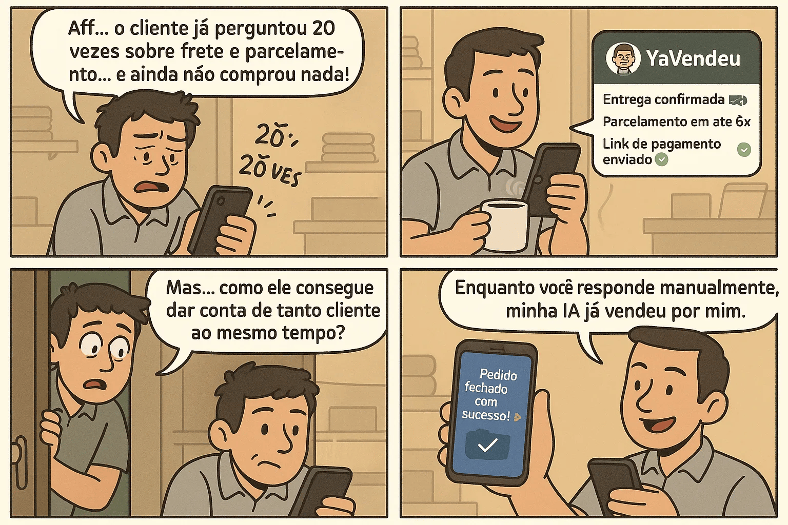 Muitos lojistas ainda acham que estar no online é só “abrir uma lojinha” e esperar vender. Mas sem planejamento, estratégia e tecnologia, a pressa vira inimiga da conversão. Na tirinha desta semana, mostramos de forma divertida como a YaVendeu ajuda a transformar improviso em vendas inteligentes com IA. 🚀